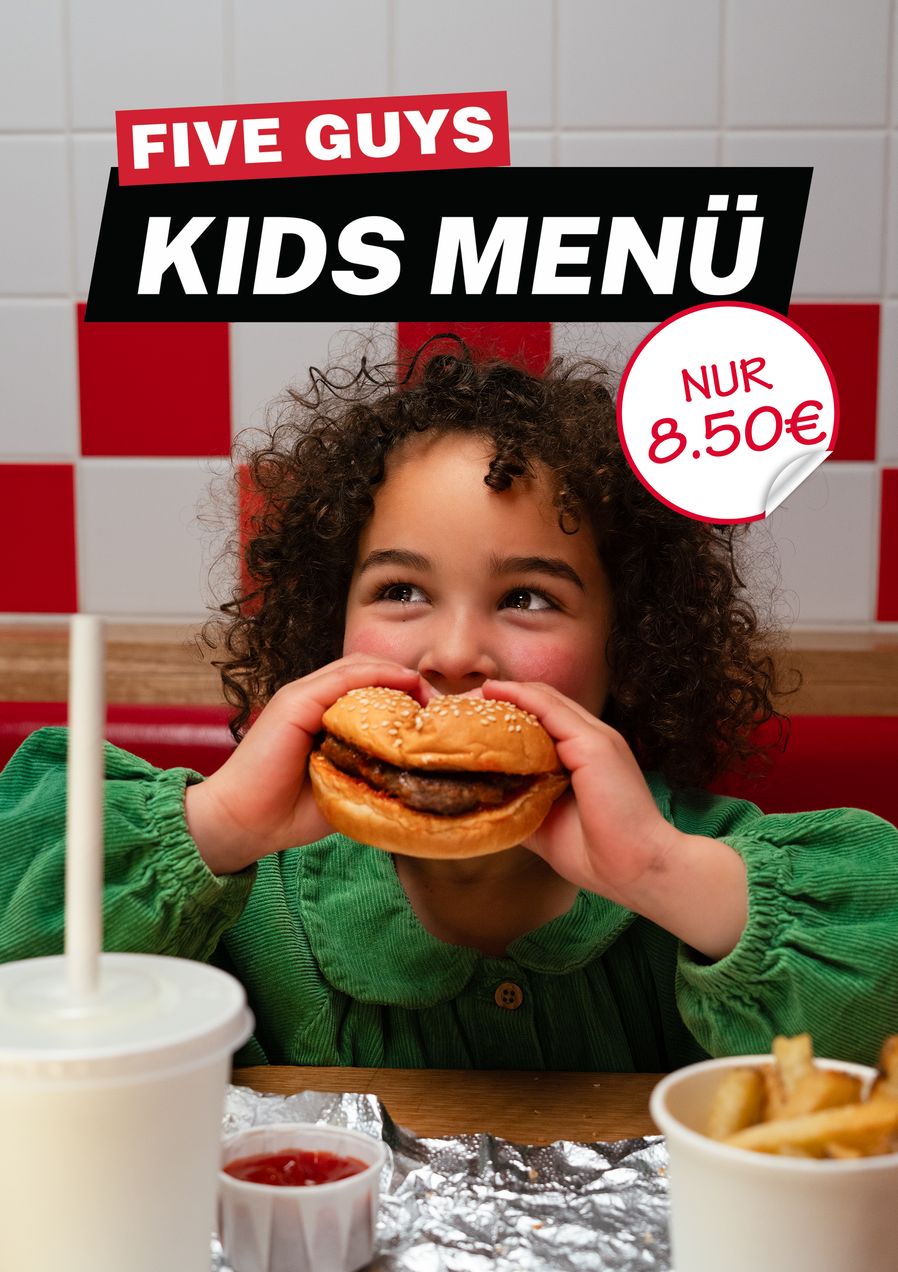 Du hast die Qual der Wahl: Entscheide dich für einen kleinen Hamburger, einen Hot Dog oder ein Grilled‑Cheese‑Sandwich. Dazu gibt’s eine kleine Portion Fries und ein Kids‑Getränk.Für den extra Treat kann ein little Shake für zwei Euro ergänzt werden.