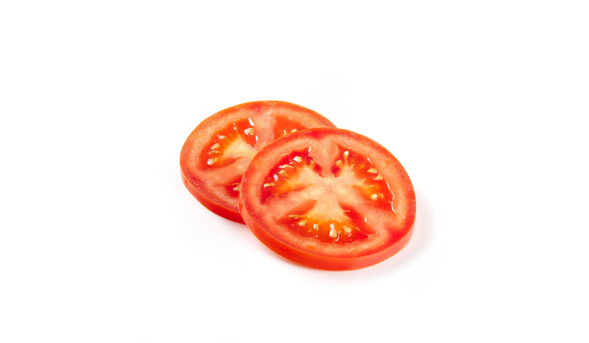 Two slices for an even tomato-to-bite ratio every time. Sliced fresh daily.