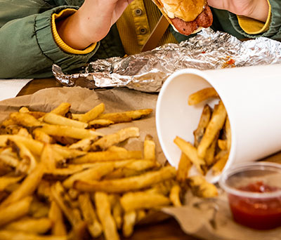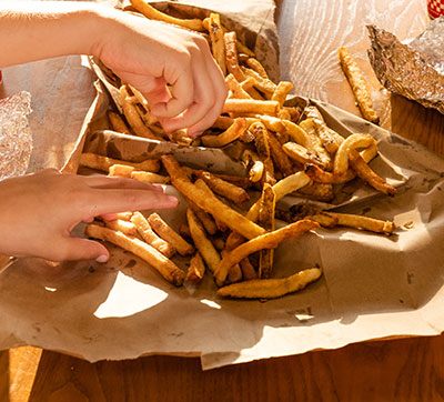 Wir bereiten alle Zutaten von Hand zu – Five Guys Ehrenwort. Unser Rindfleisch formen wir von Hand zu Pattys und unsere Fries werden direkt im Store aus frischen Kartoffeln handgeschnitten. Und das ist noch nicht alles: Jeden Morgen starten unsere Crews schon früh in den Tag, um alles sorgfältig von Hand vorzubereiten – vom gezupften Salat bis zu fein geschnittenen Paprika und Jalapeños.